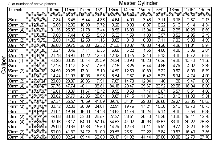 A case in point: I had a complaint from a racer about Ferodo CP901- a compound renown for its great feel. His comment was that they worked poorly until the wheel locked. He had been thrown on the ground twice. Intrigued, I inquired as to the application. "Yamaha RD350" he replied. A red flag went up. CP901 was not available for the 48mm Yamaha caliper. I asked "How that could that be?" He had up-graded his braking system with the 41mm Lockheed unit, but was unaware that a master cylinder change was in order. A stock RD 350 has an already poor ratio of 18.3 :1, and with Lockheed, became an unhealthy 13.3 :1. The "sweet spot" formula said a change to a 11 or 12mm master cylinder was in order: my personal preference and recommendation would have been an 11mm. He was able to switch to a 1/2" , and although not ideal, he was keeping the rubber side down.For 2 piston opposed calipers, I like ratios in the 27:1 range, feeling some line and caliper flex. For a firmer lever, use 23:1. I think ratios lower than 23:1 produce a lever feel so "wooden" as to have little, if any feel. Combine "low" leverage ratios with sticky pads, and unpredictable lockup is the result. The high effort required at the lever also results in undesired input to the bars. Single piston calipers are much happier in the 14:1 to 12:1 range. Disc and wheel diameters, as well as hand lever ratios, must be considered.